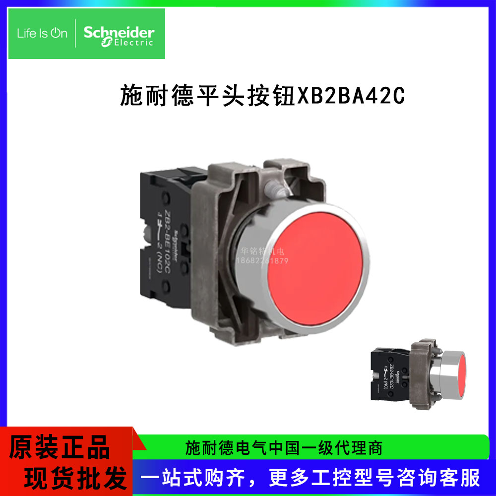 Schneider/施耐德電氣XB2B平頭按鈕XB2BA42C是一款彈簧復(fù)位,安裝直徑22mm輔助觸點(diǎn)1NC的紅色平頭按鈕,XB2BA42C=ZB2BZ102C+ZB2BA4C。